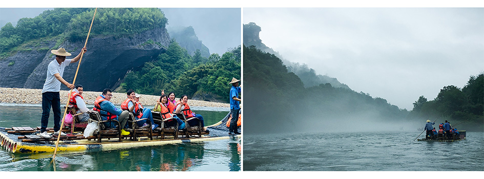 晨光熹微,大家有幸坐上了竹筏,沿?九曲溪?漂流而下。清溪如帶,奇峰倒影,艄公的幽默講解讓大王峰、玉女峰的傳說(shuō)更添生動(dòng)。
